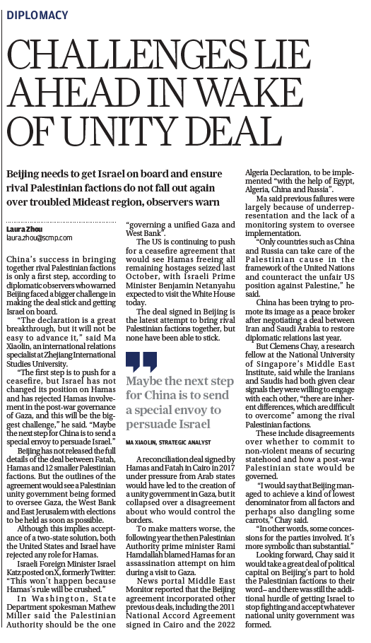 I told local Chinese media outlet Zaobao that despite the diplomatic victory claimed by Beijing at bringing all 14 Palestinian factions together to sign a declaration, the deal represents acquiescence with the lowest common denominator. There are inherent differences, ideological or otherwise, among the parties and particularly between Fatah and Hamas, which both have a poor track record in reconciliation. Further, China’s pledge to the cause will require it to employ much greater political capital.